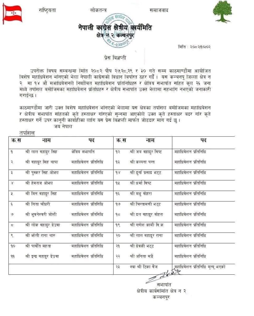 शुक्रबार क्षेत्रीय सभापतिले प्रेस विज्ञप्ति जारी गरेर कञ्चनपुर क्षेत्र नं. २ बाट विशेष महाधिवेशनमा २३ जना महाधिवेशन प्रतिनिधिहरू सहभागी नभएको जनाएका छन् । विज्ञप्तिमा भनिएको छ, ‘काठमाडौंमा विशेष महाधिवेशन भनिएको भेलामा यस क्षेत्रका तपशिल बमोजिमका महाधिवेशन र क्षेत्रीय सभापतिसहितको कीर्ते हस्ताक्षर गरिएको सुन्नमा आएकोले उक्त कीर्ते हस्ताक्षर बदर गरि कीर्ते हस्ताक्षर गर्ने उपर कानूनी कारबाहीका लागि जोडदार माग गर्दछु ।’