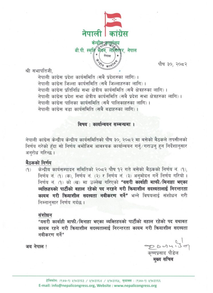 शनिबार पार्टी केन्द्रीय कार्यालय, सानेपाका मुख्यसचिव कृष्णप्रसाद पौडेलद्वारा जारी सर्कूलरमा केन्द्रीय कार्यसम्पादन समितिको बैठकले अनुशासनको कारबाही फुकुवा गरी क्रियाशील सदस्यता नवीकरण गर्ने निर्णय गरेको बताएका छन् ।