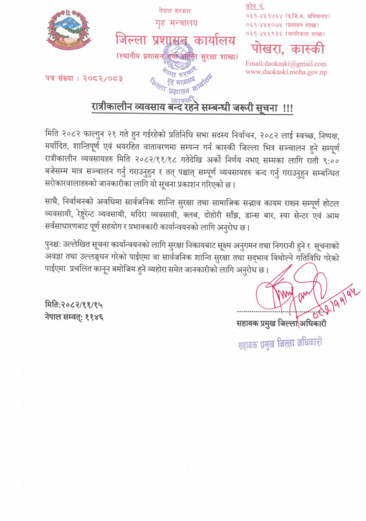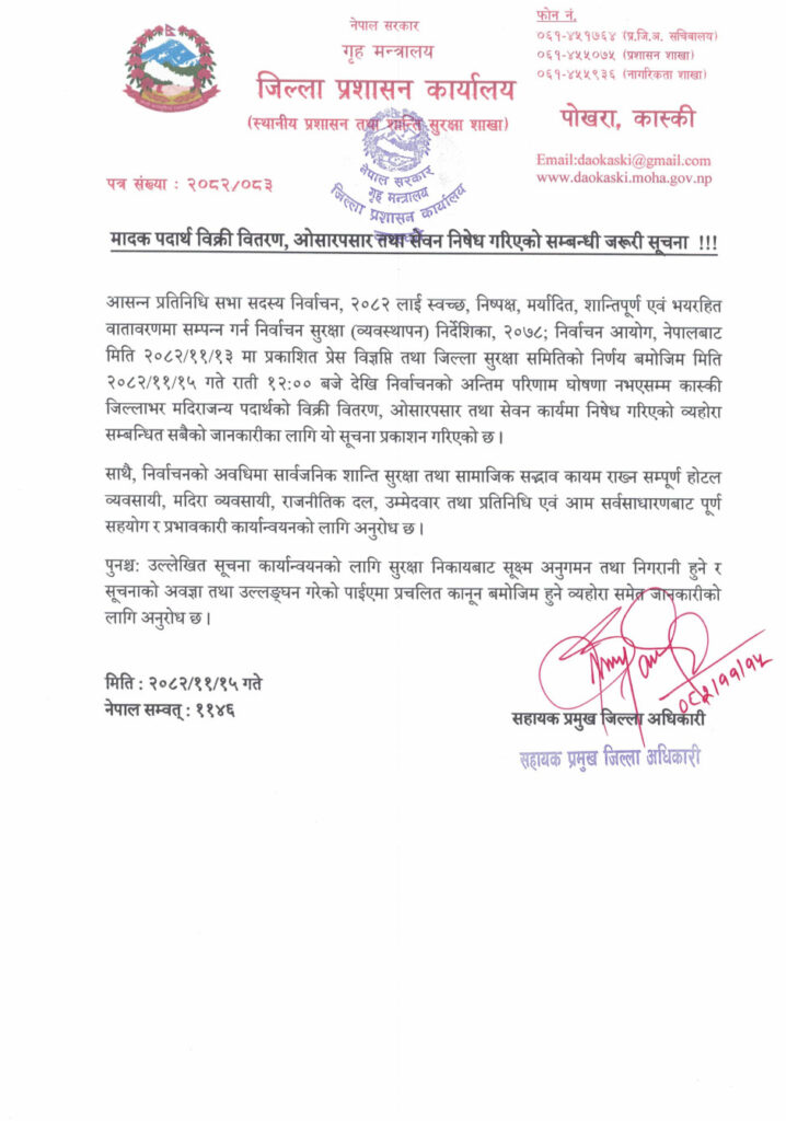 कास्की प्रशासनले २०८२ फागुन १५ गतेदेखि मादक पदार्थ बिक्री–वितरण, ओसारपसार तथा सेवनमा निषेध लगाएको छ । फागुन १८ गतेदेखि रात्रिकालीन व्यवसाय बन्द गर्नुपर्ने कास्की प्रशासनको आदेशमा उल्लेख छ ।