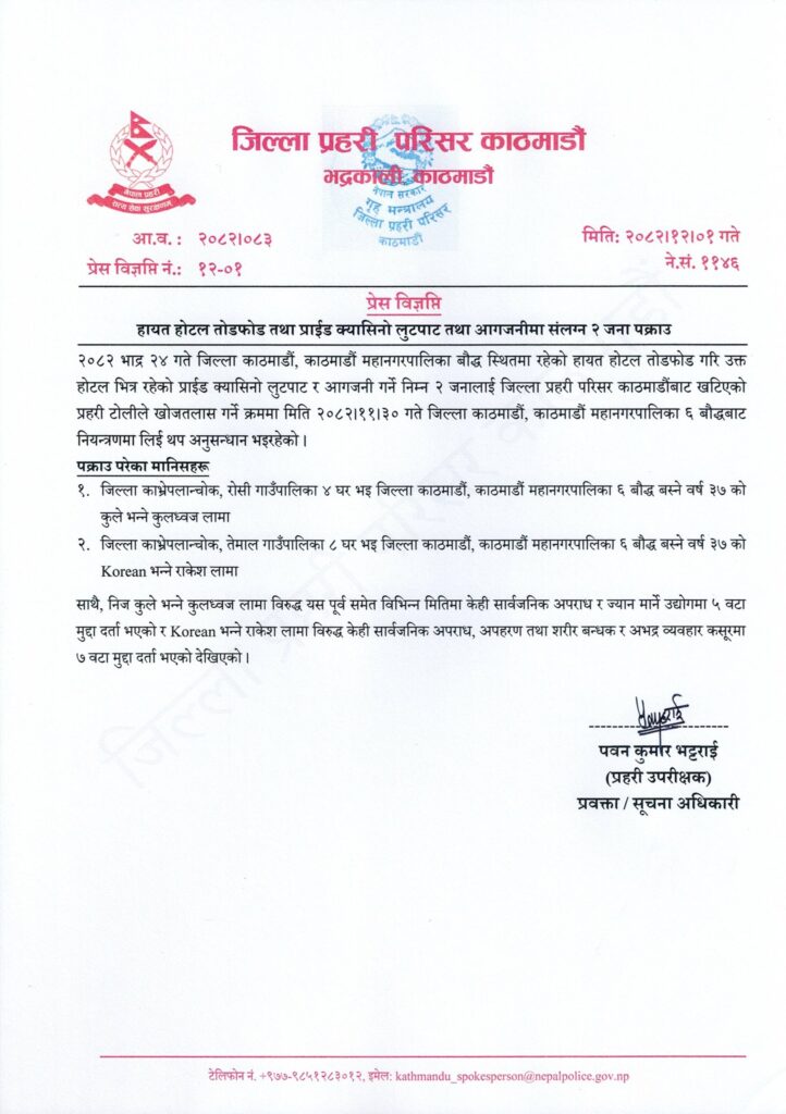 काठमाडौं । जिल्ला प्रहरी परिसर, काठमाडौंले हायत होटल तथा प्राईड क्यासिनो लुटपाट र आगजनीमा संलग्न दुई जना गुण्डा नाइकेलाई पक्राउ गरेको छ ।