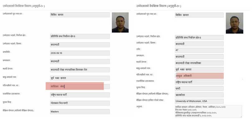 सञ्चारकर्मी विराट अनुपमले रास्वपाका नेता एवम् सांसद खनालको नैतिक आचरणमा गम्भीर प्रश्न उठाएका छन् । निर्वाचन आयोगमा बुझाएको दुई विवरणको दस्तावेज राखेर सामाजिक सञ्जालमार्फत प्रश्न गरेका छन्, ‘श्रीमतीको नाममा फरकफरक चुनावमा फरकफरक नाम राखिएको छ । किन होला शिशिर सर ?’