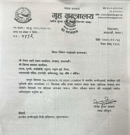 द काउन्सिल अफ जेनजी लुम्बिनीले गृहमन्त्री सुधन गुरुङलाई लुम्बिनी प्रदेशका १२ जिल्लाका अबैध रुपमा सञ्चालन भएका क्रसर उद्योगहरू बन्द गर्न माग गरेर निवेदन दिएको थियो ।