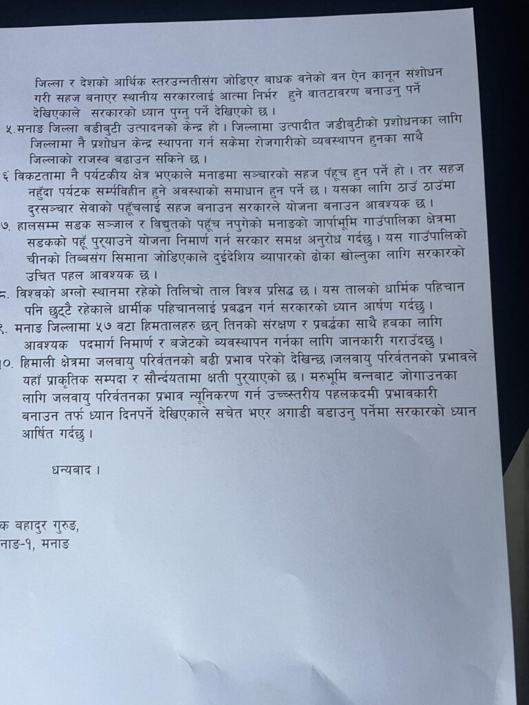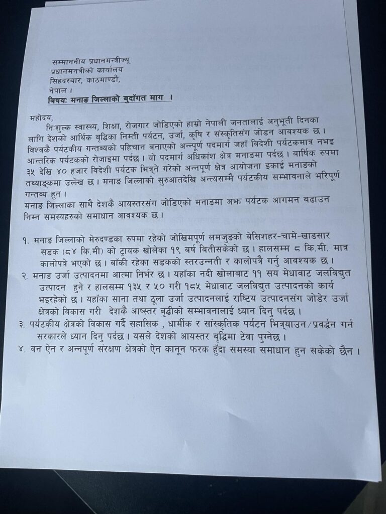 ‘हालसम्म सडक सञ्जाल र विद्युतको पहुँच नपुगेको मनाङको नार्पाभूमि गाउँपालिका क्षेत्रमा सडकको पहुँ पुर्याउने योजना निमार्ण गर्न सरकार समक्ष अनुरोध गर्दछु,’ उनले भने, ‘यस गाउँपालिको चीनको तिब्बसंग सिमाना जोडिएकाले दुईदेशीय व्यापारको ढोका खोल्नुका लागि सरकारको उचित पहल आवश्यक छ ।’