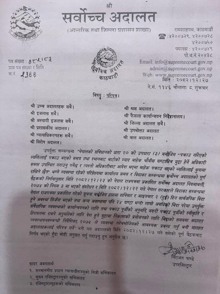 सर्वोच्चले बिदाका समयमा पनि आवश्यक न्यायिक सेवा सञ्चालनका लागि ‘बिदाको समयमा अदालत व्यवस्थापनसम्बन्धी निर्देशिका, २०७५’ अनुसार व्यवस्था मिलाउन मातहत अदालतहरूलाई निर्देशन दिएको छ ।