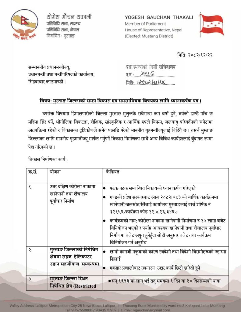 प्रधानमन्त्रीसँग कांग्रेस सांसद थकालीले राखेको लिखित मागपछि निषेधित क्षेत्रमा हेलिकप्टर उडानमा सहजीकरण