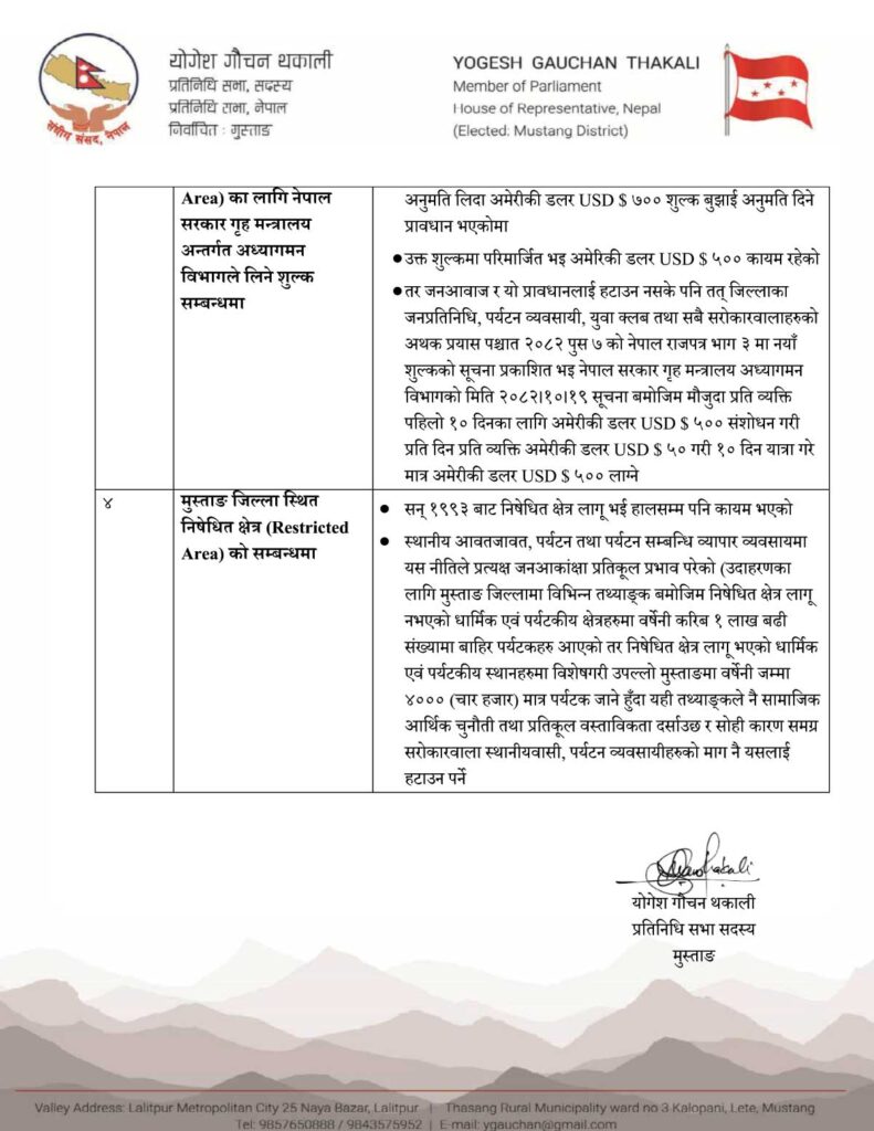निषेधित क्षेत्रमा हेलिकप्टरबाट उडान गर्दा पूरा गर्नुपर्ने लामो कागजी प्रक्रियाका कारण कतिपय स्वदेशी नागरिक र बिरामी पर्यटकको समयमा उद्धार हुन सकेको थिएन । सो विषयमा मुस्ताङका सांसद थकालीले प्रधानमन्त्री बालेन्द्र शाह (बालेन)सँग गण्डकी प्रदेशका प्रत्यक्ष निर्वाचित सांसदहरूसँगको छलफलका क्रममा मौखिक र लिखित सुझाव नै राखेका थिए । प्रधानमन्त्री शाहले सांसद थकालीको मागअनुसार सहजीकरण गर्न मातहतलाई निर्देशन दिएका थिए ।