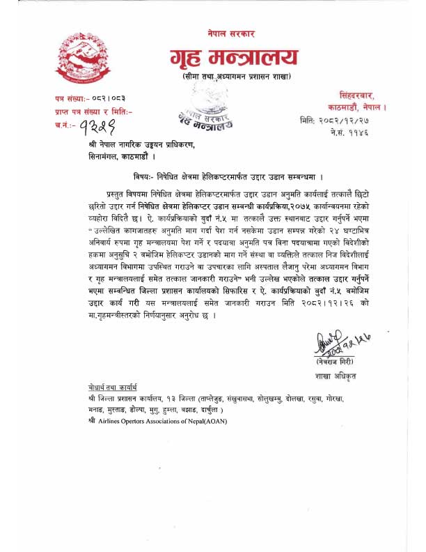 गृह मन्त्रालयले नेपाल नगरिक उड्डयन प्राधिकरण र मुस्ताङसहिता १३ जिल्लालाई बोधार्थ गरेर पठाएको पत्रअनुसार अब निषेधित क्षेत्र हेलिकप्टर उडान सम्बन्धी कार्यप्रक्रिया २०७५ को बुँदा ५ बमोजिम उद्धार कार्य गरी गृह मन्त्रालयलाई जानकारी गराए पुग्नेछ ।