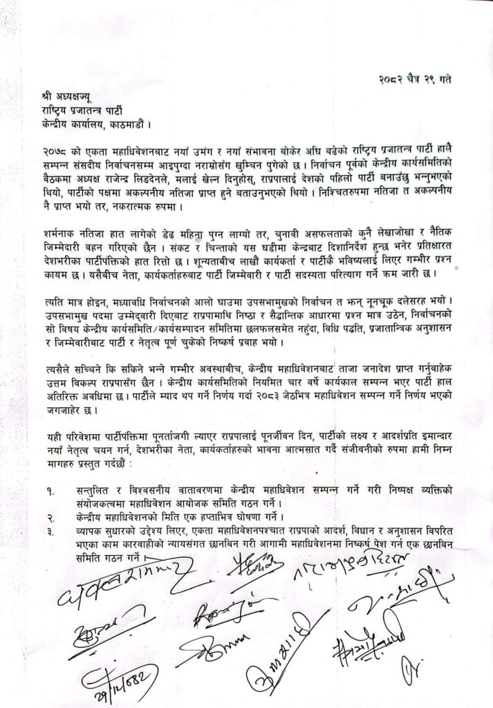राप्रपाले प्रतिनिधि सभा निर्वाचनमा भोगेको हारको समीक्षा नेतृत्वले नगरेको भन्दै महामन्त्री धवलशम्शेर राणासहितका ११ जनाले पार्टी महाधिवेशनको आह्वान गरेका छन् । उनीहरूले अध्यक्ष राजेन्द्र लिङ्देनको विकल्प खोज्नुपर्ने माग गरेका छन् ।