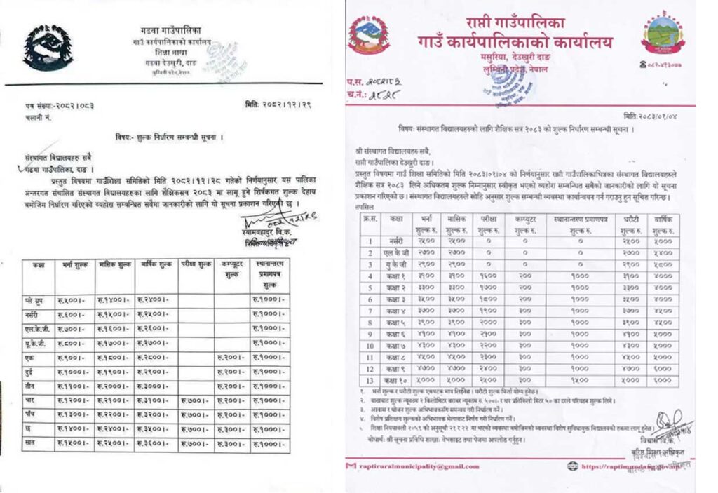 अध्यक्ष विष्टले राप्ती गाउँपालिका अन्तर्गत सञ्चालित संस्थागत विद्यालयहरूले लिने शुल्क छिमेकी गढवा गाउँपालिकाका विद्यालयहरूको तुलनामा अत्याधिक महँगो रहेको छ । राप्ती र गढवा गाउँपालिकाले शैक्षिक सत्र २०८३ का लागि सार्वजनिक गरेको शुल्क संरचना हेर्दा ठूलो भिन्नता देखिएको छ ।