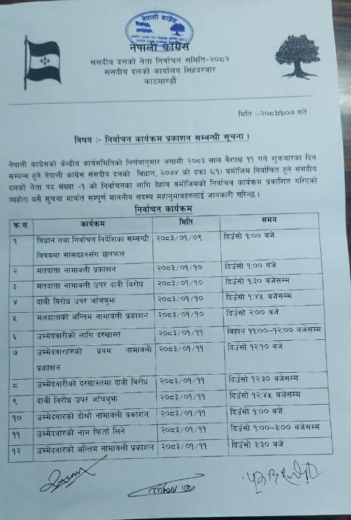 काठमाडौं । नेपाली कांग्रेसले वैशाख ११ गते संसदीय दलको नेता चयन गर्न निर्वाचन सम्बन्धी कार्यतालिका सार्वजनिक गरेको छ ।