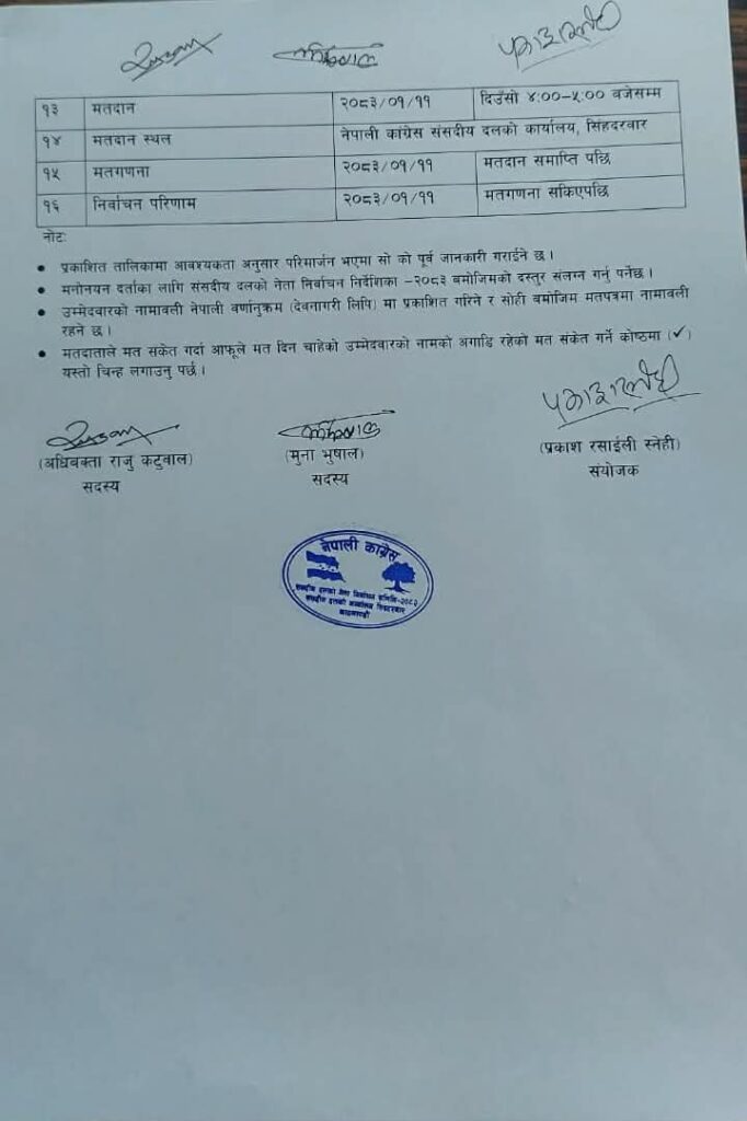 निर्वाच समितिले संसदीय दलको कार्यालय, सिंहदरबारमा ११ वैशाख दिउँसो ४ देखि ५ बजेसम्म मतदान हुनेछ । समितिले संसदीय दलको विधान अनुसार निर्वाचन कार्यतालिका तय गरिएको जानकारी गराएको छ ।