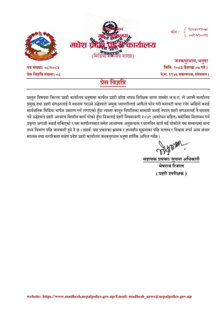 विज्ञप्तिमा भनिएको छ, ‘प्रस्तुत विषयमा जिल्ला प्रहरी कार्यालय धनुषामा कार्यरत प्रहरी वरिष्ठ नायव निरीक्षक सागरशम्शेर जबराले आफ्नै कार्यालय प्रमुख तथा प्रहरी संगठनलाई नै बदनाम गराउने उद्धेश्यले अमुक व्यापारीलाई आफैले फोन गरी बनावटी कथा रचेर अडियो बनाई सार्वजनिक मिडियामार्फत प्रसारण गर्न लगाएको हुँदा त्यस्ता कानून विपरीतका सामाग्री बनाई नेपाल प्रहरी संगठनलाई नै बदनाम गर्ने उद्धेश्यले प्रहरी आचरण बिपरीत कार्य गरेको हुँदा निजलाई प्रहरी नियमावली २०७१ (संशोधन सहित) बमोजिम निलम्बन गर्न प्रकृया अगाडि बढाई सकिएको र यस कार्यालयबाट समेत आवश्यक अनुसन्धान र छानविन कार्य भई रहेकोले यस सम्बन्धमा सत्य तथ्य विवरण पछि जानकारी हुने नै छ ।’