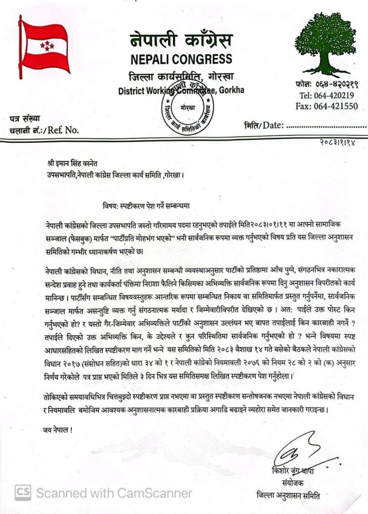 तोकिएको समयमा चित्तबुझ्दो जवाफ नआए पार्टीको विधान र नियमावली अनुसार कारबाही प्रक्रिया अघि बढ्ने गोरखा कांग्रेसको अनुशासन समितिले चेतावनी दिएको छ ।