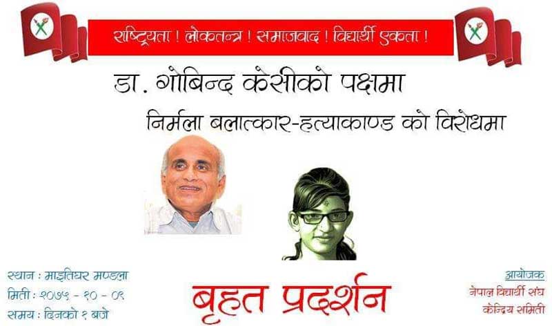 ‘डा.गोविन्द केसीले मेडिकल शिक्षाको सुधार माग गरेर अनसन बस्दा पनि कम्युनिस्ट सरकारले सुनुवाइ गरेन । निर्मला पन्तका बलात्कारी र हत्यारालाई अहिलेसम्म पक्राउ गर्न नसकेपछि सरकारविरुद्ध वृहत प्रदर्न गर्न लागेका छौँ’, उनले भने, ‘सरकार विरोधी कार्यक्रममा सहभागी हुन सबैमा अपील गरेका छौँ ।’