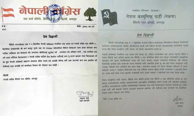 बागलुङ । सत्तारुढ नेपाल कम्युनिस्ट पार्टी (नेकपा) नेतृत्वको कम्युनिस्ट सरकार भ्रष्टाचारमा चुर्लुम्म डुबेका बेला नेपाली कांग्रेस बागलुङले कम्युनिस्टहरूसँग मिलेर भ्रष्टाचार गर्ने आफ्नै निर्वाचित वडा सदस्यलाई कारबाही गरेको छ ।
