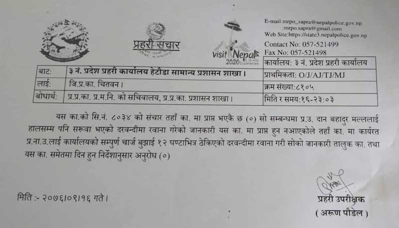 ‘यस कार्यालयको सि.नं. ८०३४ को सञ्चार तहाँ कार्यालयमा प्राप्त भएको छ । सो सम्बन्धमा प्रहरी उपरीक्षक दानबहादुर मल्ललाई हालसम्म पनि सरुवा भएको दरबन्दीमा रवाना गरेको जानकारी यस कार्यालयमा प्राप्त हुन नआएकोले तहाँ कार्यालयमा कार्यरत उहरी नायब उपरीक्षकलाई कार्यालयको सम्पूर्ण चार्ज बुझाई १२ घण्टाभित्र ठेकिएको दरबन्दीमा रवाना गरी सोको जानकारी तालुक कार्यालय तथा यस कार्यालयमा समेत दिनु हस निर्देशनाअनुसार अरोध छ’, सञ्चार पत्रमा उल्लेख छ ।