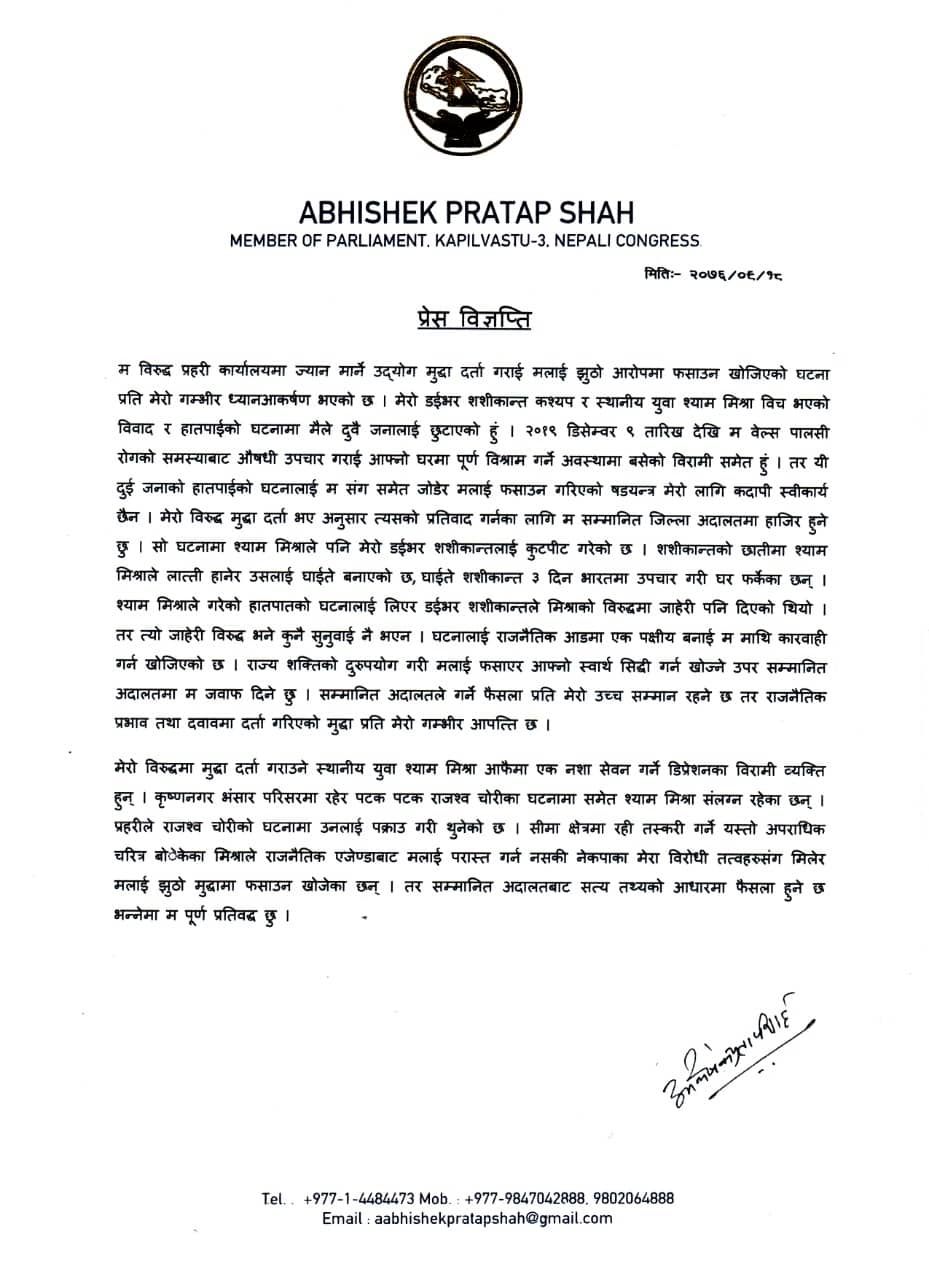 नेपाली कांग्रेसका युवा नेता एवम् प्रतिनिधि सभाका सांसद शाहले शुक्रबार विज्ञप्ति जारी गरेर आफूलाई झुठ्ठा मुद्धा लगाएर फसाउन खोजिएको भन्दै आपत्ति जनाएका छन् । उनले नशालु पदार्थ सेवन गरेर आएका श्याम मिश्राले आफूलाई अभद्र व्यवहार गर्दा चालक शशिकान्त कश्यपसँग हातपाइ भएको बताएका छन् ।