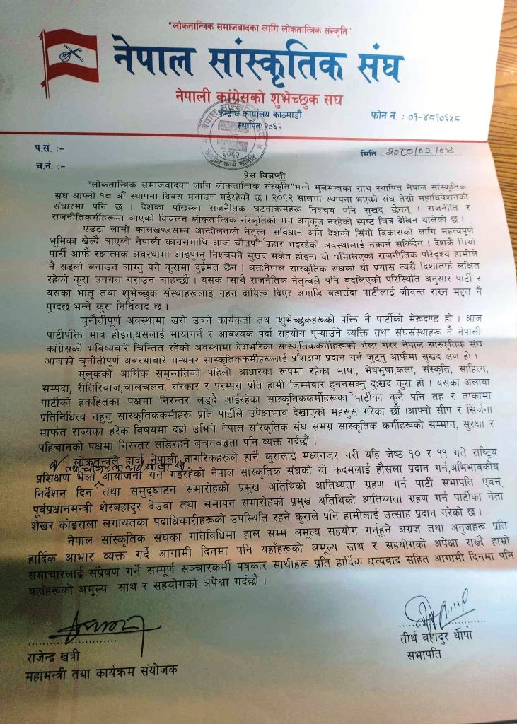 ‘एउटा लामो कालखण्डसम्म आन्दोलनको नेतृत्व, संविधान अनि देशको सिंगो विकासको लागि महत्वपूर्ण भूमिका खेल्दै आएको नेपाली कांग्रेसमाथि आज चौतर्फी प्रहार भइरहेको अवस्थालाई नकार्न सकिँदैन’, विज्ञप्तिमा भनिएको छ, ‘देशकै मियो पार्टी आफै रक्षात्मक अवस्थामा आइपुग्नु निश्चयनै सुखद संकेत होइन ।’