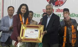काठमाडौं । नेपाली कांग्रेसका सभापति एवम् पूर्वप्रधानमन्त्री शेरबहादुर देउवाले ओलम्पिक पदक विजेता पलेशा गोवर्धनलाई नगदसहित सम्मान गरेका छन् । आइतबार...