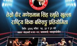 ललितपुर । ललितपुर जिल्लाकाे गोदावरी नगरपालिका चापागाउँको प्याङगाउँ चौरमा तेस्रो वीर गणेशमान सिंह स्मृति खुल्ला राष्ट्रिय किक बक्सिङ प्रतियोगिता हुने...